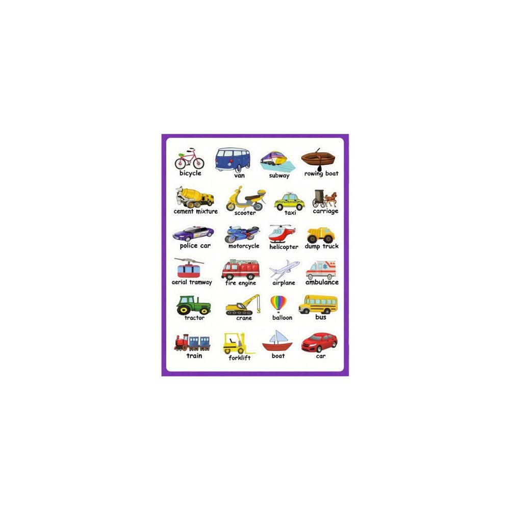 Educational transportation stickers featuring 5 sheets with 24 stickers each. Perfect for teaching children about various modes of transport with colorful designs. Ideal for classrooms and learning activities.