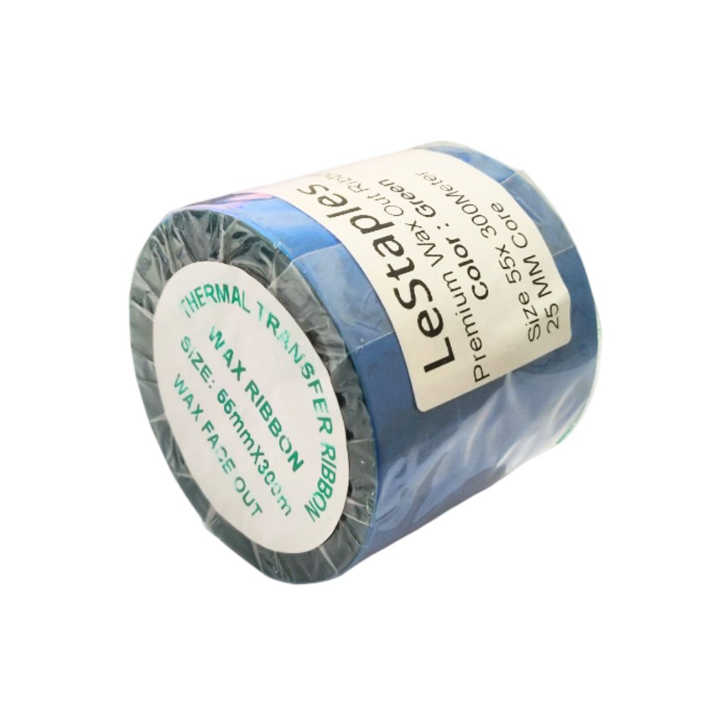 The Wax Ribbon 55mm x 300 Meter with 1-inch core in green color is ideal for high-quality thermal transfer printing on paper labels. It delivers sharp, bright green prints that are perfect for color-coded labeling, product identification, inventory management, and highlighting key information.